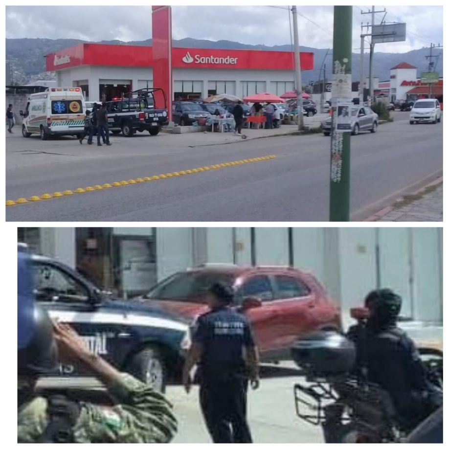 Sujetos fuertemente armados asaltaron la sucursal bancaria Santander, ubicada en el estacionamiento de la Plaza San Cristóbal (Chedraui), en la zona poniente de la ciudad de San Cristóbal de Las Casas.
