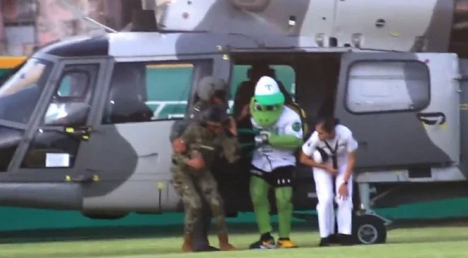 Así llegó la mascota de los Olmecas de Tabasco a un juego de la LMB