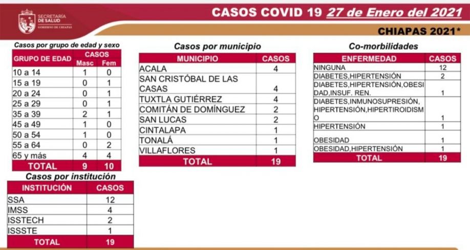 Los casos nuevos se presentaron en los municipios siguientes: Acala, San Cristóbal de Las Casas y Tuxtla Gutiérrez, cuatro cada uno; Comitán y San Lucas, dos cada uno; y Cintalapa, Tonalá y Villaflores, un caso cada uno.